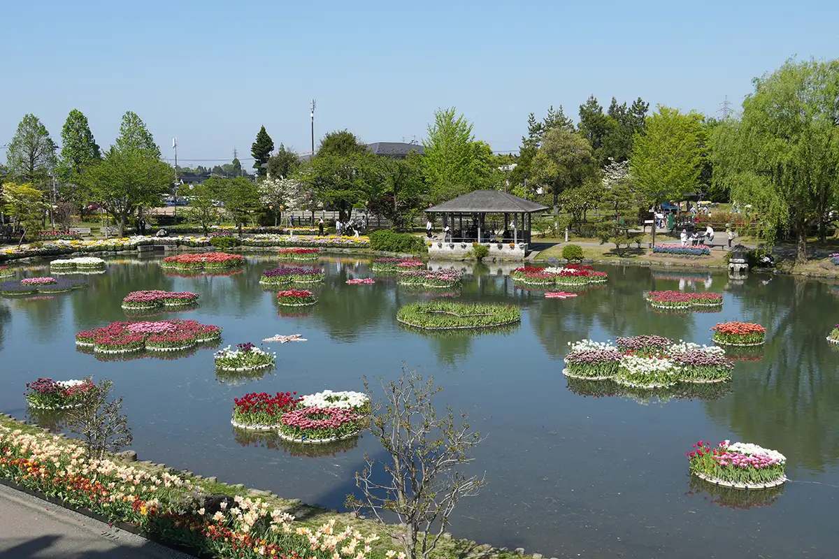 池の中にもチューリップが咲き、庭園のようです。