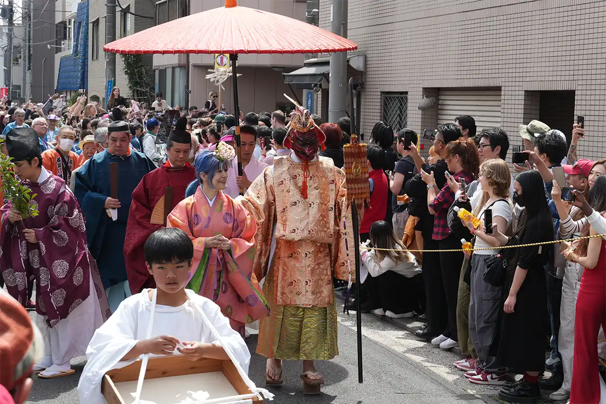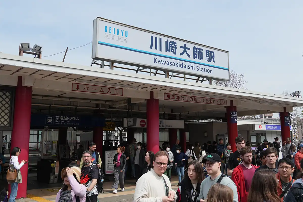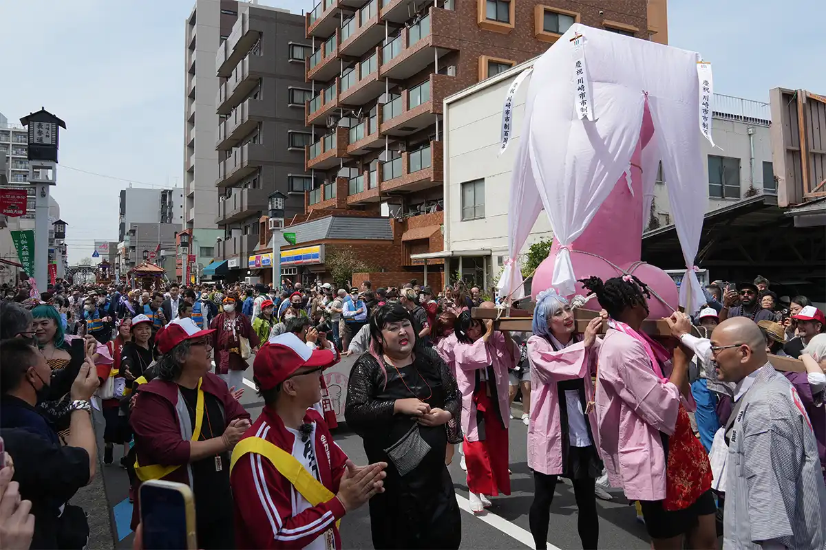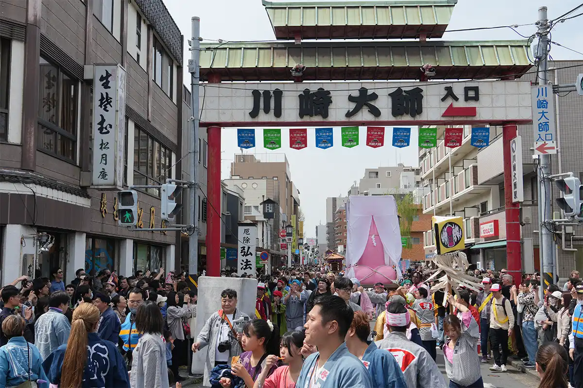 行列は川崎大師周辺の小道を通り抜け、大師公園へ向かいます。金山神社境内は大変混雑しますが、パレードコースはスペースに比較的余裕があり、神輿と一緒に動きながら見学できます。
