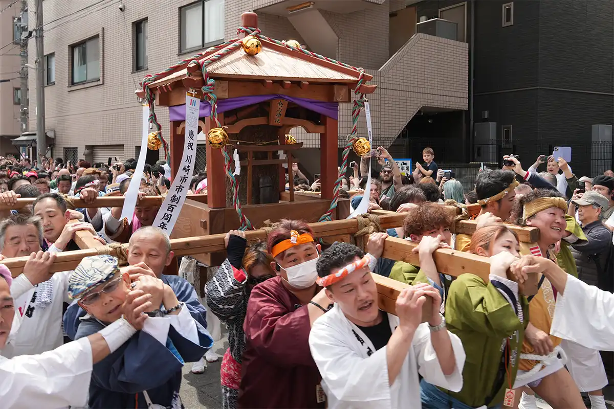 かまなら祭りは京急川崎大師駅から徒歩5分、金山神社のお祭りです。みこし行列は四月第二日曜日の午前11時半からはじまります。