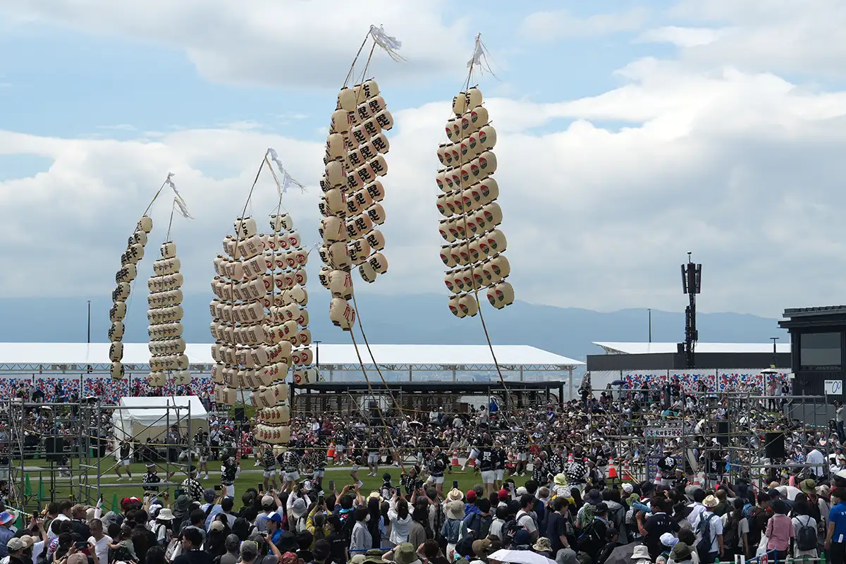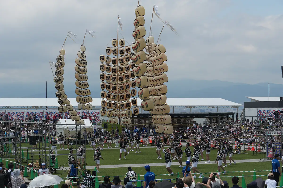 メインイベントは、安全上パレード形式にできない秋田竿灯まつりの演舞でスタートします。東北の夏にはない強風に悩まされ、午前の回では形が保てませんでしたが、午後の回ではきれいに上がりました。