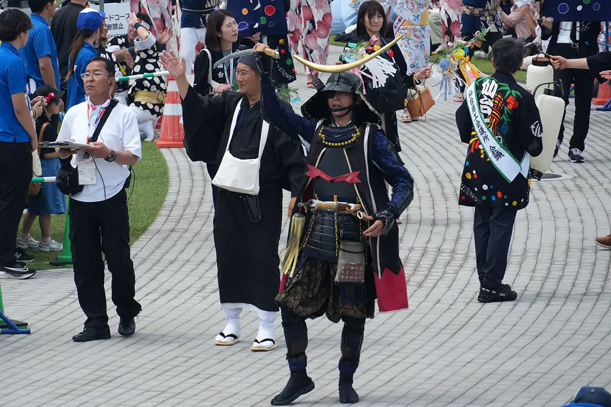 仙台は、伊達政宗公の先導で登場です。仙台を代表する祭りといえば七夕祭りですが、飾りつけが中心でありパレードにはなじまないことから、六魂祭、絆まつりでは例年、もう一つの代表的な祭り、雀踊りも一緒に参加しています。
